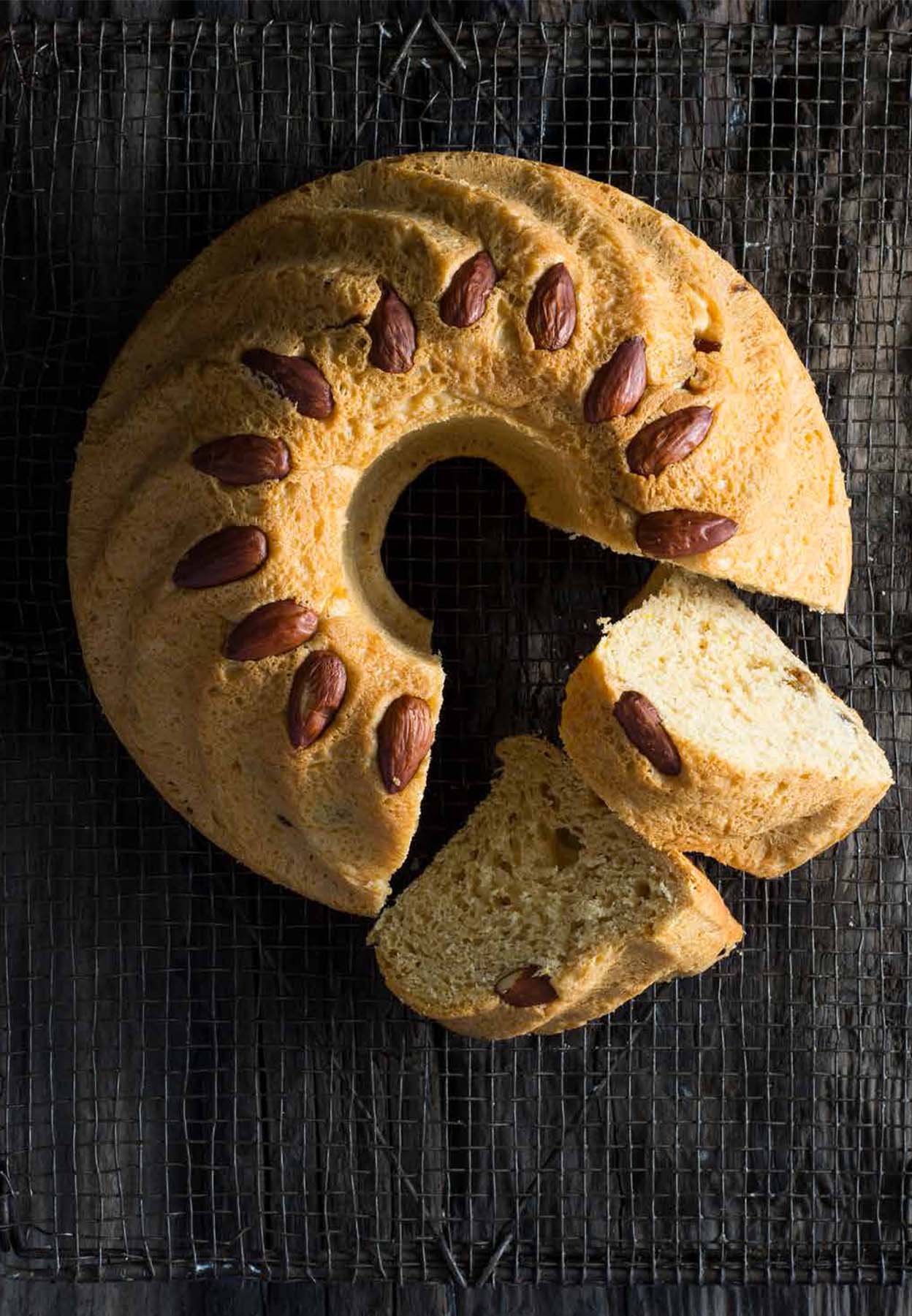 Kugelhopf is a very traditional yeasted cake enjoyed throughout much of Europe, though it originated in Austria. You need to have a tall, decorative wavy ring mould to make an authentic kugelhopf. When you remove the baked cake from the mould, it has a regal ring shape, like a crown — and inside you’ll find a bready, mildly sweet, vanilla-flavoured cake dotted with raisins and decorated with roasted almonds. I think it’s a perfect breakfast cake, but you can eat it all day really — all year round! It makes great toast, if it lasts the day.