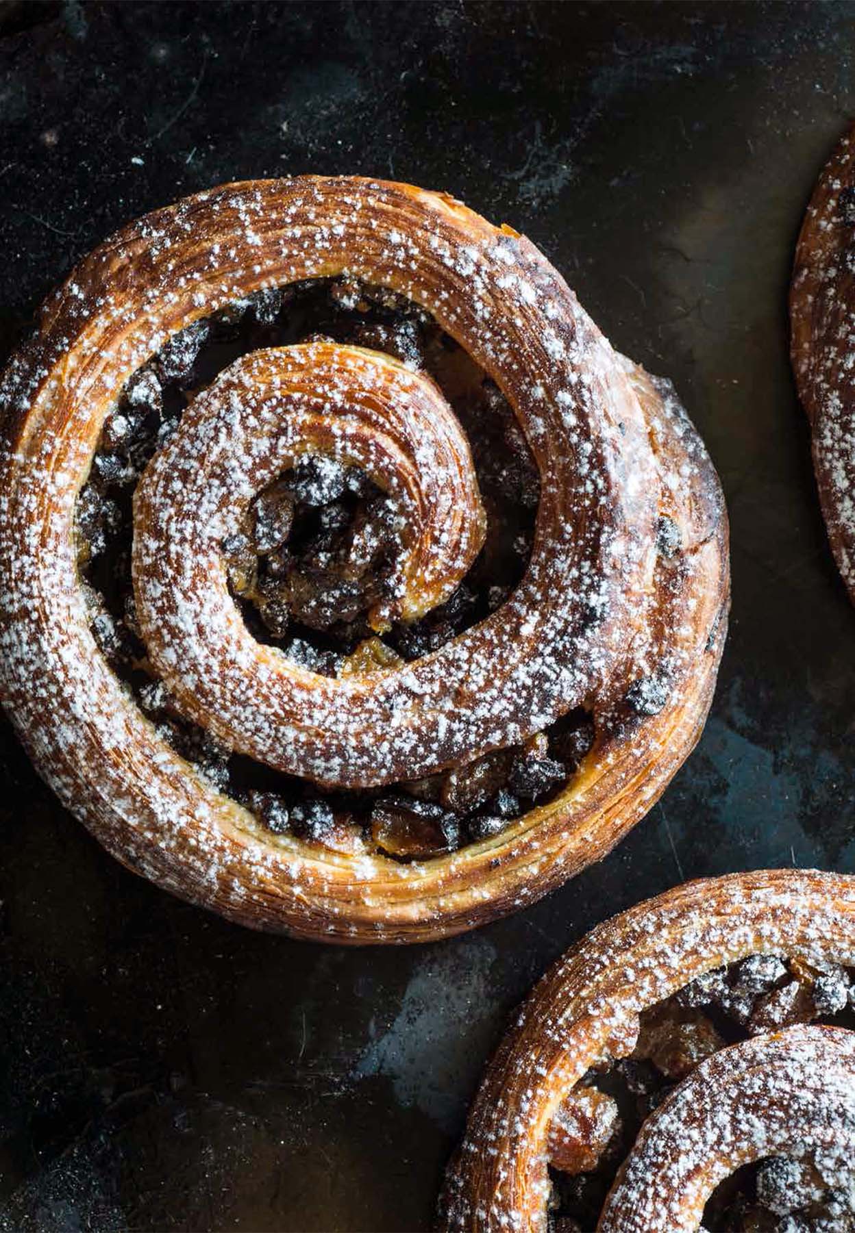 A French breakfast classic, known in Australia as a ‘snail’. Early in the morning, we often find the pale English face of our friend Alan Benson (best food photographer in the world, but average at people — just look at our head shot) squashed up against our fogged-up shop glass, trying to force his way in to eat trays of these, his favourite pastry. Alan, thanks for making this book visually delectable! You’ll need to plan ahead for these, making the fruit mix and crème pâtissière at least one day in advance.