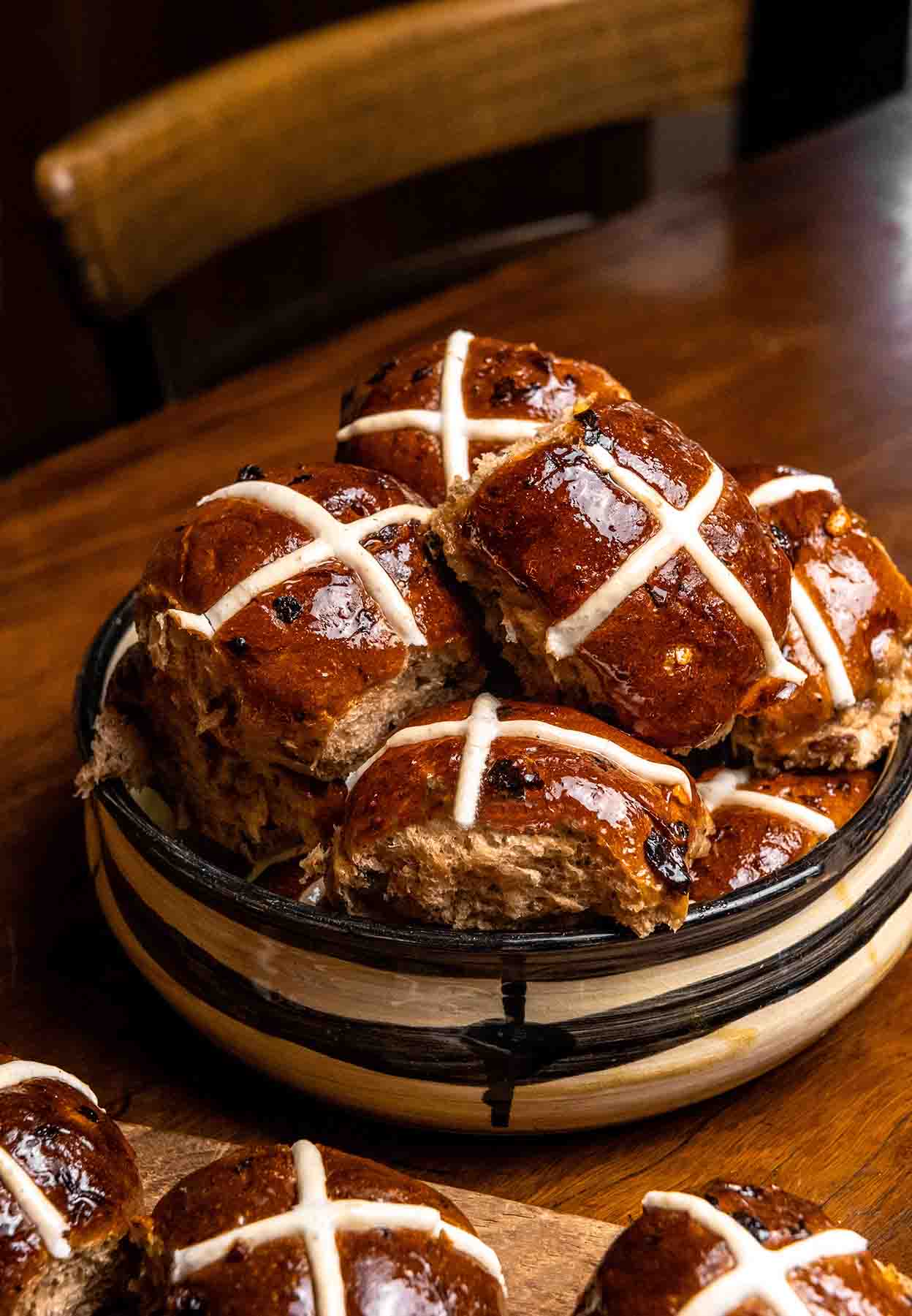 Our Traditional Hot Cross Buns are back – fruit-packed, gently spiced and baked fresh daily. Available in six or fifteen packs, they’re made for long weekends, shared tables and thick swipes of butter. Prefer something richer? Our Chocolate & Cranberry Hot Cross Buns (four or fifteen packs) fold dark chocolate through soft dough with bursts of tart cranberry. A little less traditional, still properly baked.